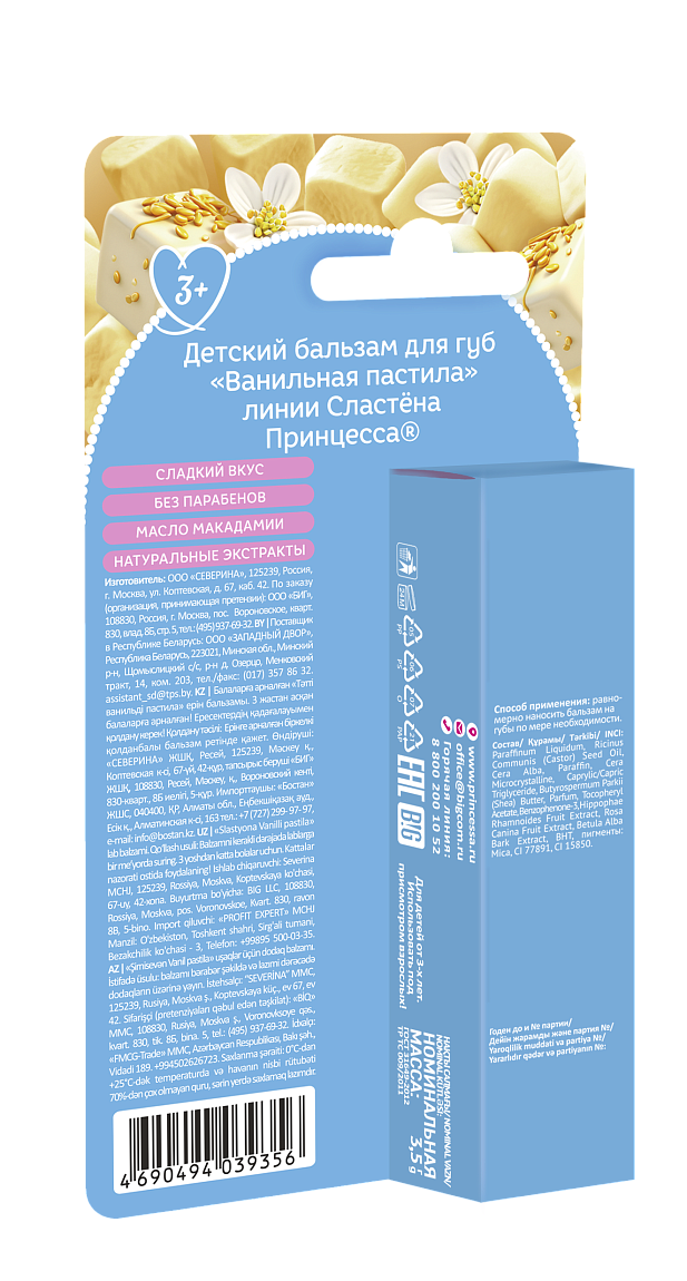 Комплекс из масла макадамии и натуральных экстрактов малины и шелковицы обеспечивает полноценный уход за нежной кожей губ, защищает и увлажняет ее. Бальзам Сластена не содержит парабенов, так как создан специально для маленьких красавиц. Теперь твои губки самые красивые и вкусные на свете!