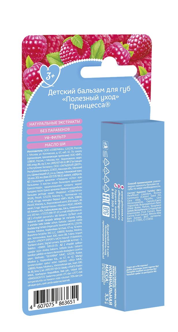 Бальзам для губ Принцесса "Полезный ухода" придает прекрасным губкам легкое сияние и обладает сочным ароматом малины. Он создан специально для маленьких красавиц, поэтому не содержит парабены и обагащен комплексом из масла макадамии и натуральных экстрактов малины и шелковицы, что обеспечивает полноценный уход за нежной кожей губ, защищает и увлажняет ее.