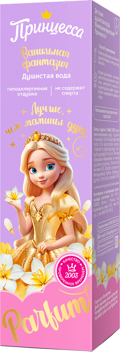 Бесспиртовая душистая вода в пластиковом флаконе абсолютно безопасна для детей. Состав душистой воды разработан специально для маленьких модниц. Содержит гипоаллергенные отдушки, аллантоин и Д-пантенол, что сводит к минимуму возможность возникновения аллергических реакций. Рекомендовано для детей от 3х лет.