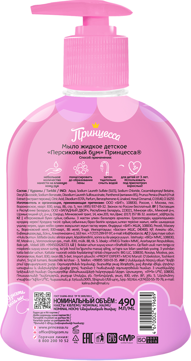 Нежный аромат персика раз за разом поднимает настроение Принцессе, нежный состав мыла обеспечивает чистоту и уход ее маленьким ручкам.