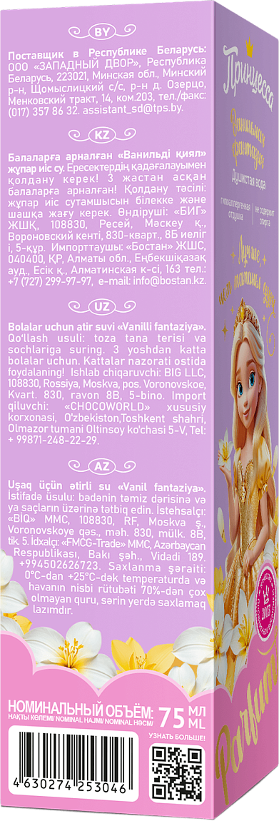 Бесспиртовая душистая вода в пластиковом флаконе абсолютно безопасна для детей. Состав душистой воды разработан специально для маленьких модниц. Содержит гипоаллергенные отдушки, аллантоин и Д-пантенол, что сводит к минимуму возможность возникновения аллергических реакций. Рекомендовано для детей от 3х лет.